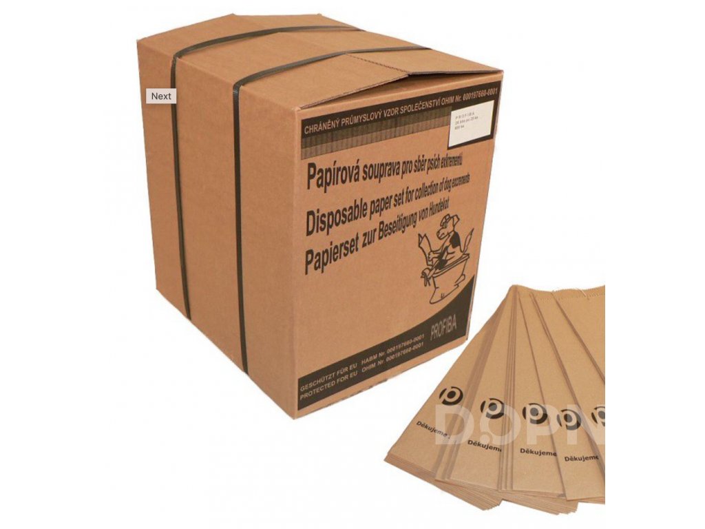 Krabice obsahující 32 svazků s papírovými sáčky na sběr psích exkrementů. V krabici je až 800 kusů papírových pytlíků, které jsou na jednotlivých svazcích po 25 kusech.