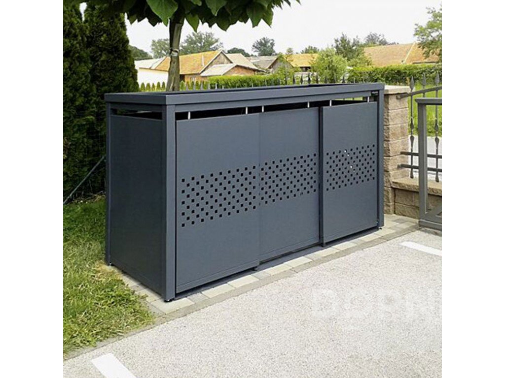 Přístřešek Qubis je vybaven hladkými posuvnými dveřmi s dírkami a speciálním systémem pro uchycení a vyklápění nádoby. Na střeše je praktický prostor pro vysypání kačírkem nebo pro osázení rostlinami.