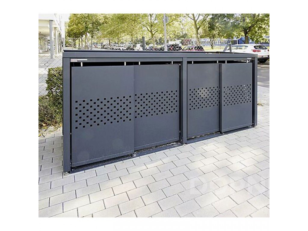 Představujeme vám přístřešek na popelnice Qubis od firmy DUKIN ze železa s posuvnými dveřmi, který je určen pro popelnice o objemu 120 l či 240 l (záleží na počtu popelnic – 2, 3 nebo 4 nádoby). Přístřešek je vyroben z vysoce odolného materiálu a je celokovový, což zaručuje jeho skvělou stabilitu a dlouhou životnost.